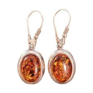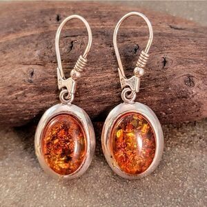 Sterling silver bezel set amber cabochon oval drop earrings. The amber has been black light tested as genuine.