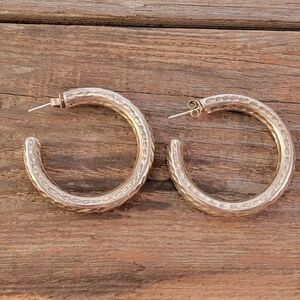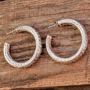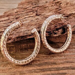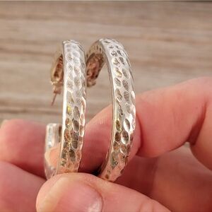 Beautiful sterling silver handcrafted hammer texture 1 5/8" hoop earrings. The earrings appear hollow but I am not sure, well made and sturdy.