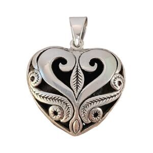 Gorgeous and unique sterling silver cutout openwork artisan created flourish engraved puffy heart pendant. This piece have a nice weight 11.5 grams and well made feel. Love this piece!!