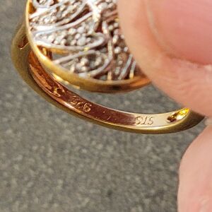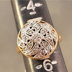 New with tags sterling silver ornate two tone gold and silver diamond round ring. The diamond chips are strategically positioned on the piece.