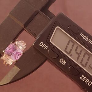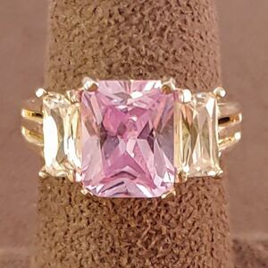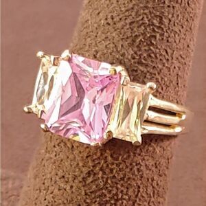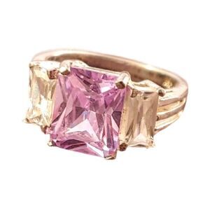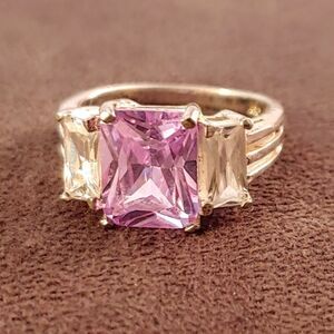 Sterling silver emerald cut rich pink cubic zirconia with two clear side cubic zirconias ring.