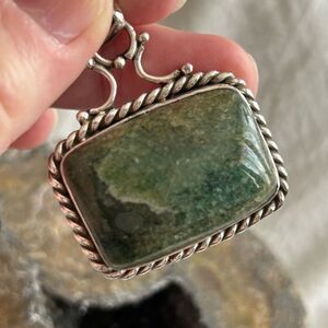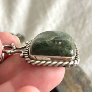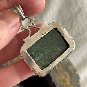 Older pendant approx 20 years. Beautiful craftsmanship and design of the silver. Bail is large enough for a thick chain or medium collar. Large and thick serpentine stone is polished on both sides.