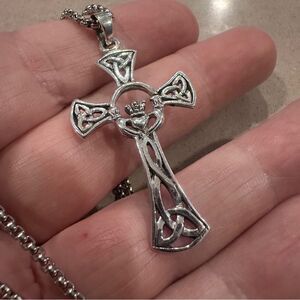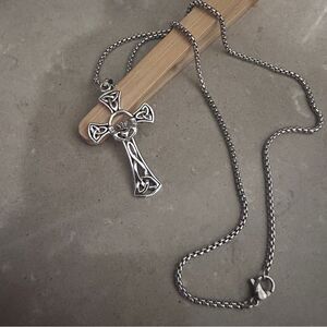 Classic sterling silver Celtic cross pendant with intricate detailing and oxidized finish. Paired with an 18” stainless steel rounded box chain for durability and everyday wear. Timeless piece perfect for layering or as a meaningful gift.