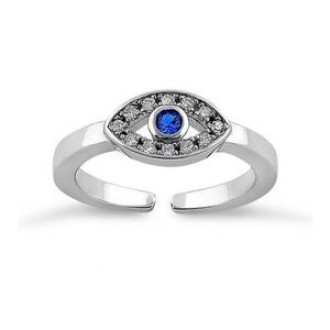 Add a touch of mystique and sparkle to your summer style with this stunning Evil Eye toe ring. Crafted in genuine sterling silver, this open-band design offers both comfort and elegance. The centerpiece features a captivating eye-shaped setting adorned with a brilliant round-cut blue sapphire cubic zirconia, surrounded by shimmering clear CZ stones that enhance its protective symbolism.