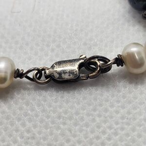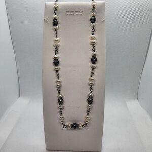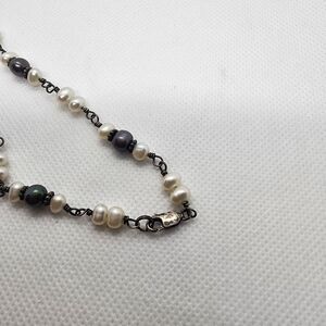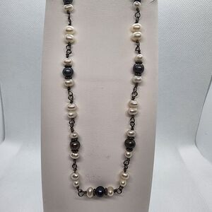 Sterling silver necklace with white and black genuine pearls.