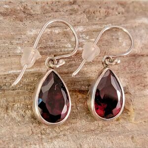 Gorgeous sterling silver bali style bezel set faceted CZ garnet pear drop earrings.