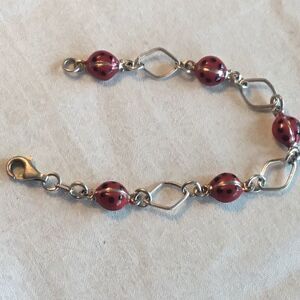 Cute as a Bug!  Perfect for ladybug lovers of all ages and in sterling silver, too.  Actual Ladybugs themselves are enameled onto the sterling in red with six black dots arch.  This is a 6” bracelet and it is in very gently used condition as reflected in all the photos.  Hallmark shown in photos.  Bugs are approx. 1/4” in width and length to give yo a better idea of the petite size.