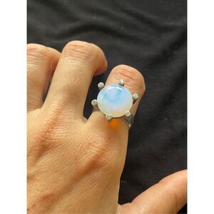 Beautiful Sterling silver ring with an opalite stone. The opalite looks like an opal and has the same beautiful colors. The stone is surrounded by 6 silver prongs with crystals on top. The ring is a size 9.