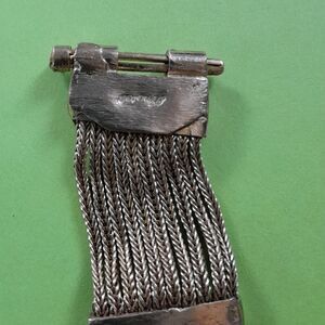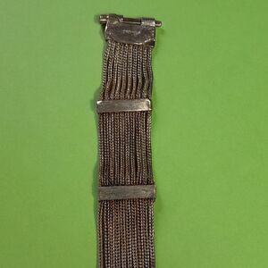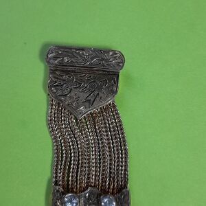 This stunning Turkish designer bracelet is about 7" long. There are 10 rows of sterling foxtail chains separated by stunning stations of Swarovski faux diamonds that look better than the real stuff. It weighs in at a whopping 33 grams of sterling. This bracelet has a matching necklace that is listed separately. The natural patina makes it look like 18K. The fancy clip closure gives it extra elegance.