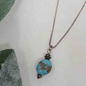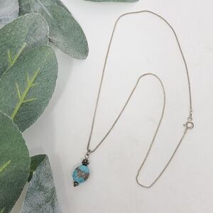 Sterling silver necklace with a turquoise pendant. The necklace measures approximately 16" long. The pendant measures approximately 3/4" long. It weighs 3.04 grams. Please see all photos. Thank you so much for looking. I am always open to reasonable offers. Have a fantastic day!