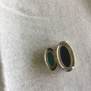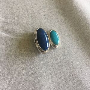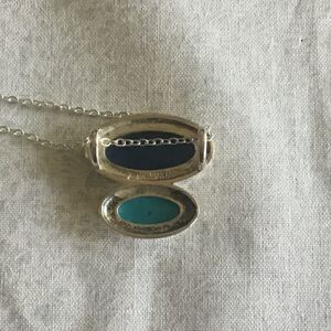 Very Gently Used as shown in the photos above. This sterling silver pendant measures 3/4” in width and has a 7/8” drop or length. Stamped. Features a bevel set oval blue lapis cabochon on op and oval turquoise stone underneath. Notice on the back side that this pendant has hoops on both sides to run your own chain through as illustrated in the photo above. CHAIN IS NOT INCLUDED, just to highlight setting.