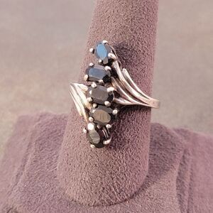 Lovely vintage sterling silver trailing black faceted spinel oval six stone ring.