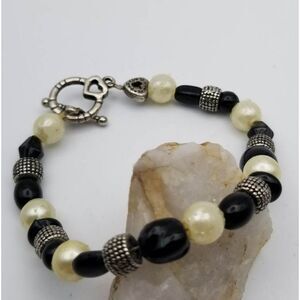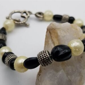 Sterling silver black and white beaded party bracelet toggle clasp B1221