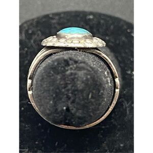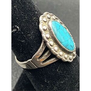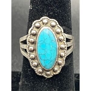 This Sterling silver 925 ring has an oval turquoise stone surrounded by silver rounders
