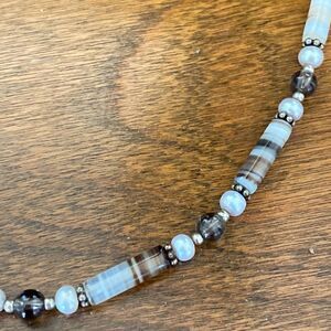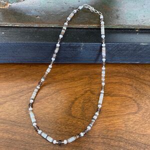EUC. Looks to be made up of strands of glass brands and seed pearls. Hallmarked 925 and measures 17.5”.