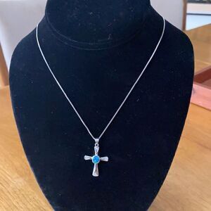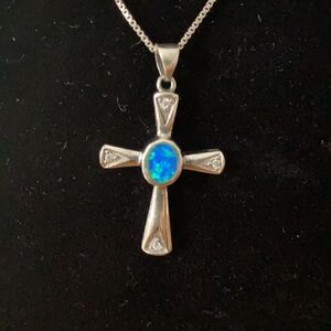 In excellent condition. Both stamped 925. Box chain is 18” and the pendant hangs just about 1.5”. Center stone is an opal and other stones are unknown.