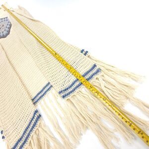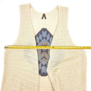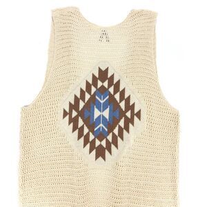 Elegant knit vest by Stetson. Beige with navy geometric design. Features fringe hem.