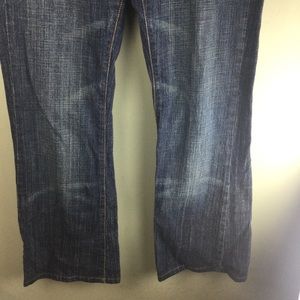 Stetson jeans. Flare leg. Heavily whiskered on the front. Zip fly with button closure. 5 pockets. Embroidered logo on back pockets. 99% cotton. 1% spandex. Tag says 6 long, but they have a shorter inseam (see included measurements).