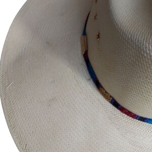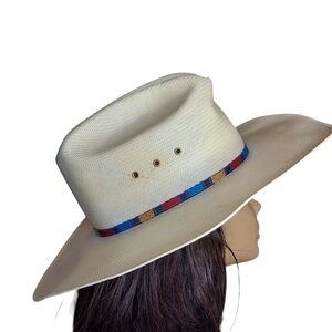 Features an Eyelet side vented crown and decorative Woven straw Cowboy hat