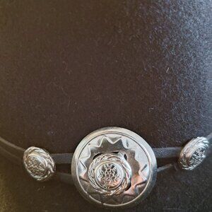 Stetson Rodeo Drive collection, Western Concho Black Hat, Unisex. Size Medium, in good condition. Height is 5" Circumference is 21", Brim width is 3". The hat is black, with a Black Felt with leather cord with three silver rounds on the cord.