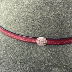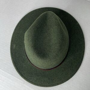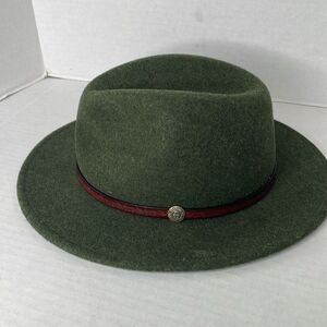 Stetson green 100% wool hat with brown leather hatband that has circular silver embossed logo. 2.5” brim with a pitch front crown. Water repellent and cleans with brush. NEW without tags