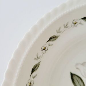 This Steubenville Monticello Cornelia Round Serving Bowl is a beautiful piece of vintage dinnerware from the 1940s. It is white with embossed trim and adorned with delicate dogwood flowers. Made in the USA.