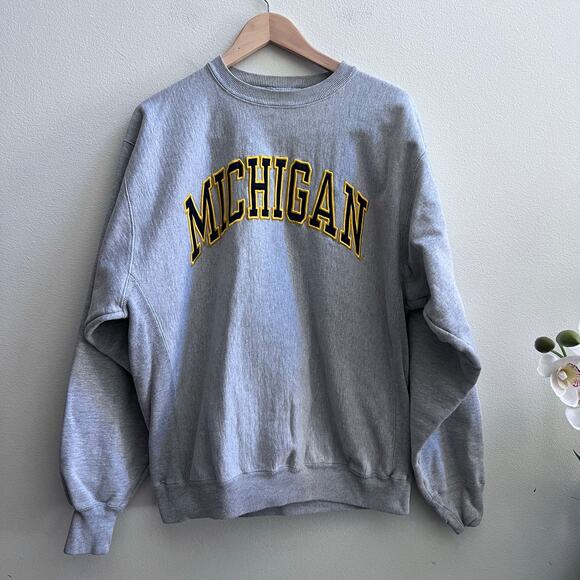 This heavy-duty sweater is a size L and features the iconic Michigan logo.