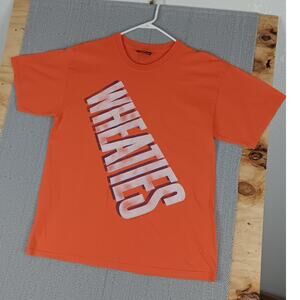 Good used condition. No major issues. Nice Wheaties spell out tee. Orange. Size Large. PLEASE check measurements pictured.
