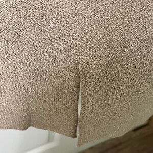 Geometric pattern in beige wool blend knit fabric is accented with metallic threading,