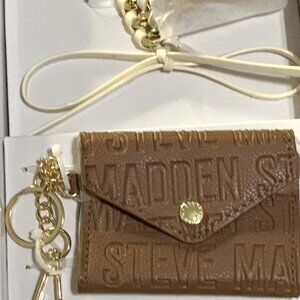 The set includes a sleek, chocolate-brown crossbody bag with embossed Steve Madden logo detailing, a matching mini wallet, and two stylish bag charms—one in a soft beige star shape and the other a mini yellow pouch with gold-tone accents.