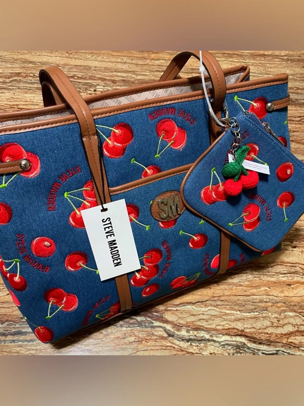 Steve Madden Bag Blue Denim Embroidered Cherries Handbag Satchel Tote Purse