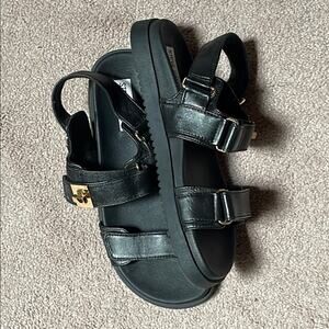 Steve Madden Adult Black Leather Sandals with Gold Hardware. 9