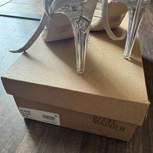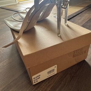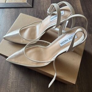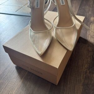 Selling these beautiful Steve Madden Alessi Pumps, brand new, never worn, and still in the original box. I purchased them for $99 for a wedding but ending up wearing a different shoe. Unable to return due to it being past the return window, but they are brand new. Clear pointed toe heels, clear heel and comfortable adjustable straps.