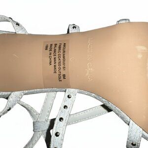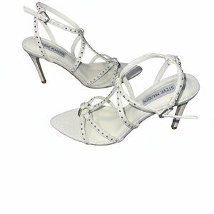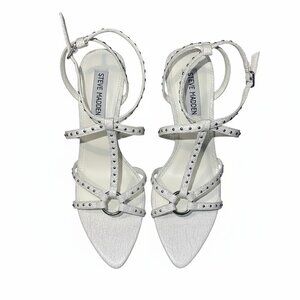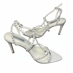 These are women's Steve Madden Amour sandals, featuring a strappy design and an overall edgy-yet-chic aesthetic. The sandals are white with a textured, subtle snakeskin or crackle pattern on the material and are heavily accented with silver-tone studs along all the straps. They feature a pointed toe, a delicate stiletto heel, and multiple thin straps that cross over the foot and wrap around the ankle, securing with an adjustable buckle. A silver-tone ring detail is present at the front of the T-strap over the toe area. The outsole states the shoe model as AMOUR, size 6M.