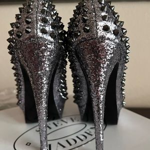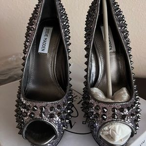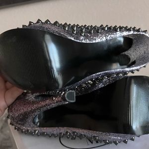 Brand new, never worn, size 7.5 in excellent condition. These are fun, unique and sexy with pewter glitter and studs all around. 6” heel with 1.5” platform.