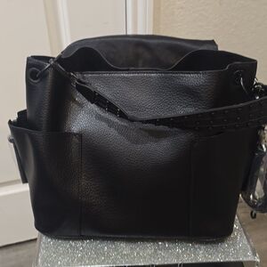 Stylish black leather messenger bag by Steve Madden. Features adjustable strap and multiple pockets. Ideal for daily use.