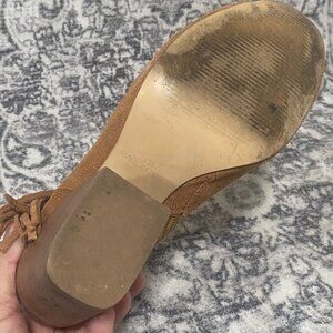 Steve Madden Baine Open Toe Suede Ankle Booties Cognac Brown Size 8, inside zipper closure, stack block heel, fringe trim