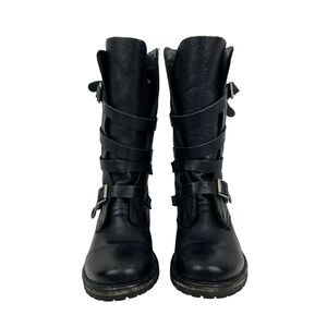 Steve Madden Banddit boots in black. These mid calf moto biker boots are made of luxe pebbled leather and feature edgy silver buckle and wrap around strap detail and a slight stacked heel with classic rounded toes. Pull on styling perfect to add a boho biker vibe to your everyday outfit! Approximately 1.45" heel, 9.5" shaft heel. Crafted in Mexico of full leather with rubber soles for durability. Women's US 7. Excellent used condition.