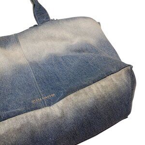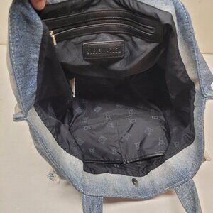 Stylish Steve Madden Banisia (aka Anisia or Banisia-D XL Cargo) denim tote with faded blue/gray wash, multi-pockets, and "S&M" logo. Preowned from a house cleanout, minor flaws (light fraying, scuffs, faint perfume scent—spot clean recommended). Measures 20.5" x 12" (8" handle). No returns, sold as-is.