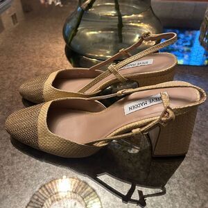 Size 8.5. Excellent condition. The Steve Madden Becka Raffia Slingback Pumps are perfect for dressing up any of your favorite spring looks to increase your compliment count! These too-cute heels feature a woven raffia construction that shapes a rounded-toe upper with a contrasting toe cap and a low-cut collar. Matching straps at the instep and outstep support a slender slingback strap that secures with a shiny gold buckle. A classic and comfortable block heel completes the chic design! 2. 75" wrapped block heel. Cushioned insole. Felted rubber sole has nonskid markings.