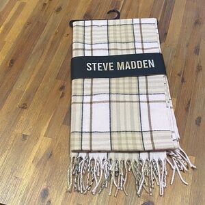 Elegant checkered scarf with fringe. Features beige and brown hues.