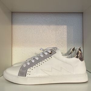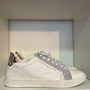 Trendy and stylish Steve Madden “Bianka” sneakers featuring a white synthetic leather upper, soft grey suede accents, and gold-tone stud details. Finished with a snakeskin print heel for a modern, elevated look. Comfortable everyday casual shoes perfect for pairing with jeans, leggings, and streetwear outfits.