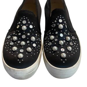 Shine like the star you are in the Steve Madden Glade Black Satin Slip-On Sneakers! These cute black satin sneakers have a slip-on design, and a rounded toe upper adorned in faux pearls, silver beads, and mirrored accents. 1.5" white rubber bumper sole.