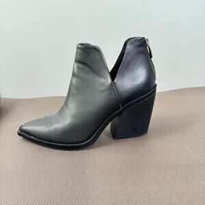 Plunging V-notch side cutouts pair with a pointed toe and block heel lending contemporary angles to the Alyse booties by Steve Madden.