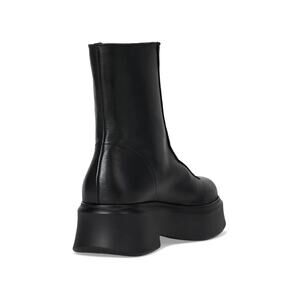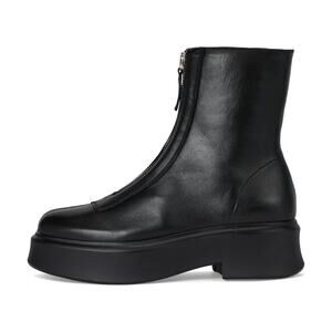 Sleek black ankle boots with front zipper. Chunky sole for added style.