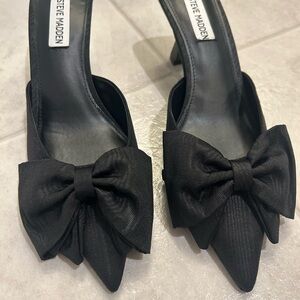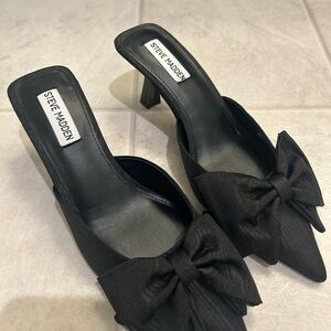 Elegant black mules with a stylish bow. Perfect for any occasion.