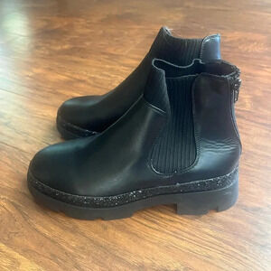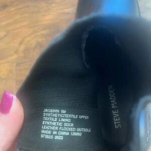 this is a brand new, never worn with no aboriginal box pair of boots by Steve Madden. These are the JRobinn black Chelsea boots. The upper is leather and the inside is synthetic. The entry into this boot is a slip on and it zips in the back. It does have give all around the ankle. This very much looks like a Chelsea boot, but with glitter! all of my items are very well cared for and come from a smoke-free home. Thanks for stopping and taking a look. Please feel free to take a look at my other items!