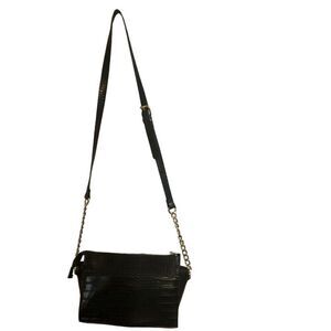 Keywords: Leather Crossbody Bag, Black Handbag, Croc-Embossed Purse, Gold Chain Strap, Women's Fashion, Zip Closure, Interior Pocket, Pre-owned Luxury, Elegant Accessory, Versatile Style, Secure Organizer, Sophisticated Design, Fabric Lined, Durable Leather, Fashionable Shoulder Bag.
