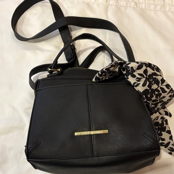 Stylish black crossbody bag by Steve Madden. Features a chic floral bow accent. Perfect for any outfit.