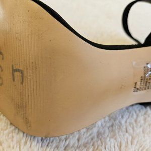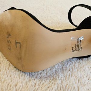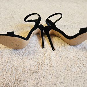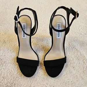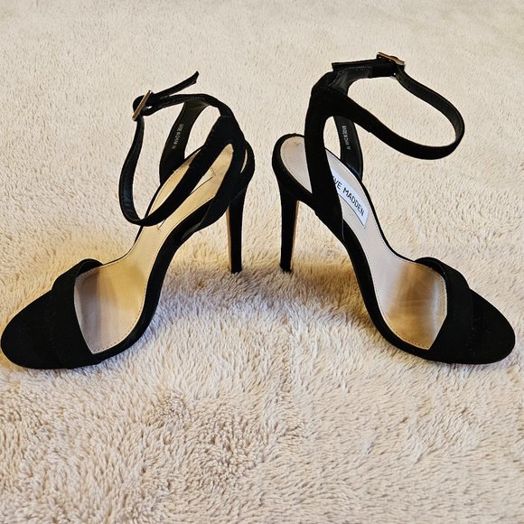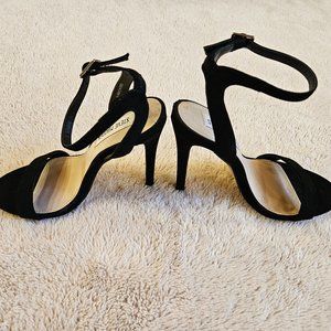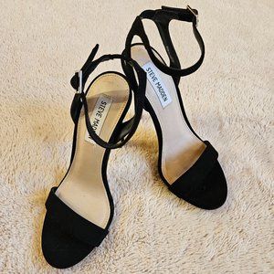 Elevate your style with these chic black heels from Steve Madden, featuring a sleek stiletto design and a delicate ankle strap. The open-toe style and soft material offer a sophisticated look, perfect for evening wear.